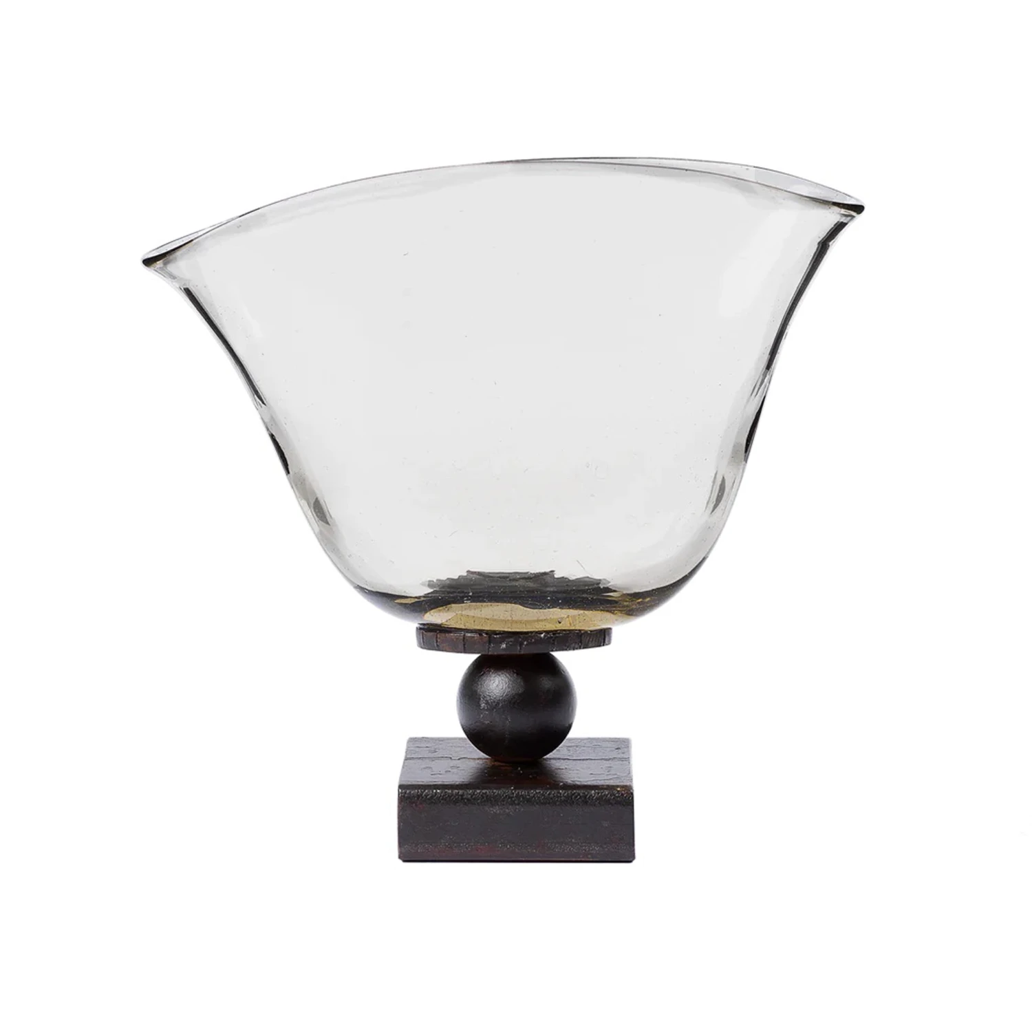 - Fan shaped mouth blown glass vase resting atop an iron balin stand