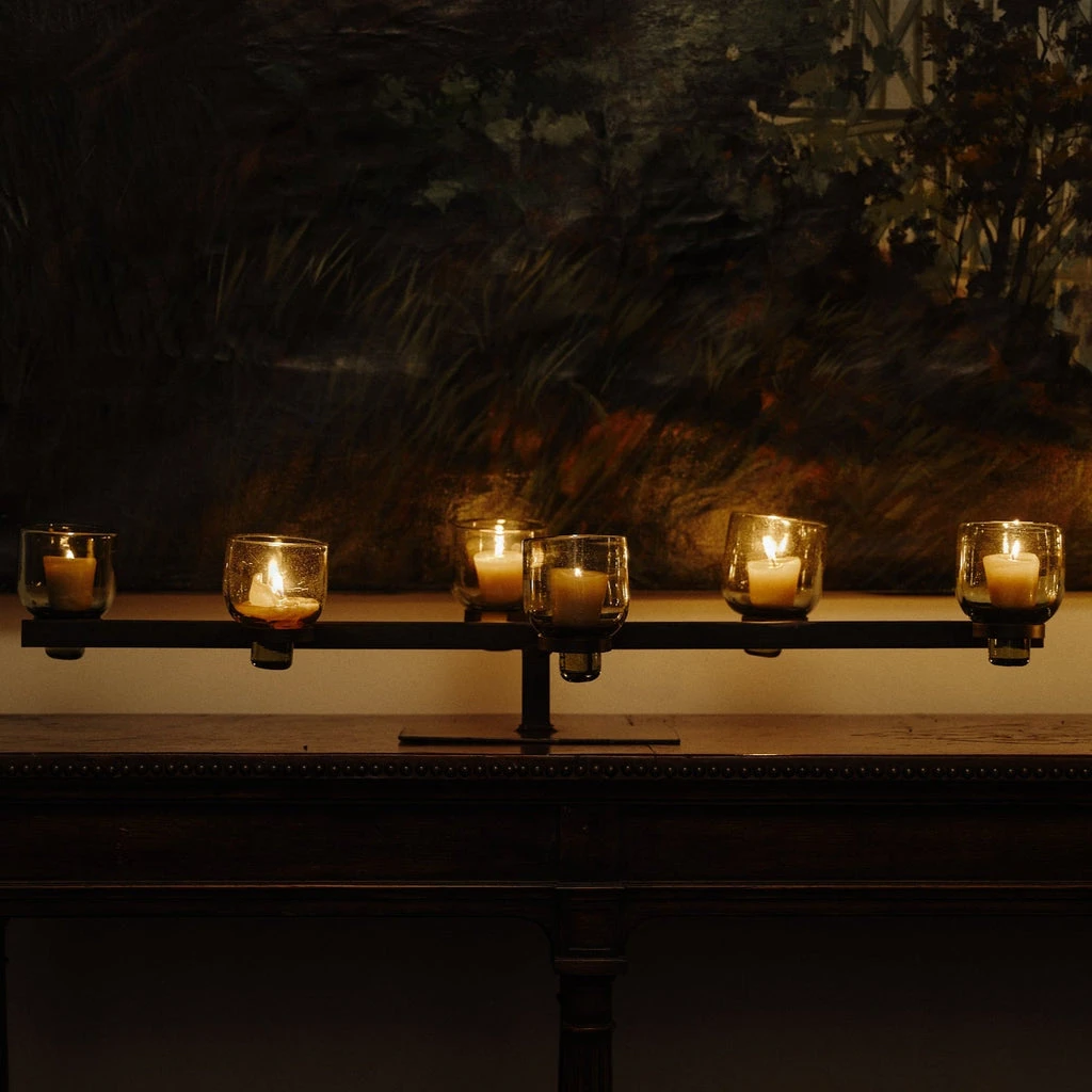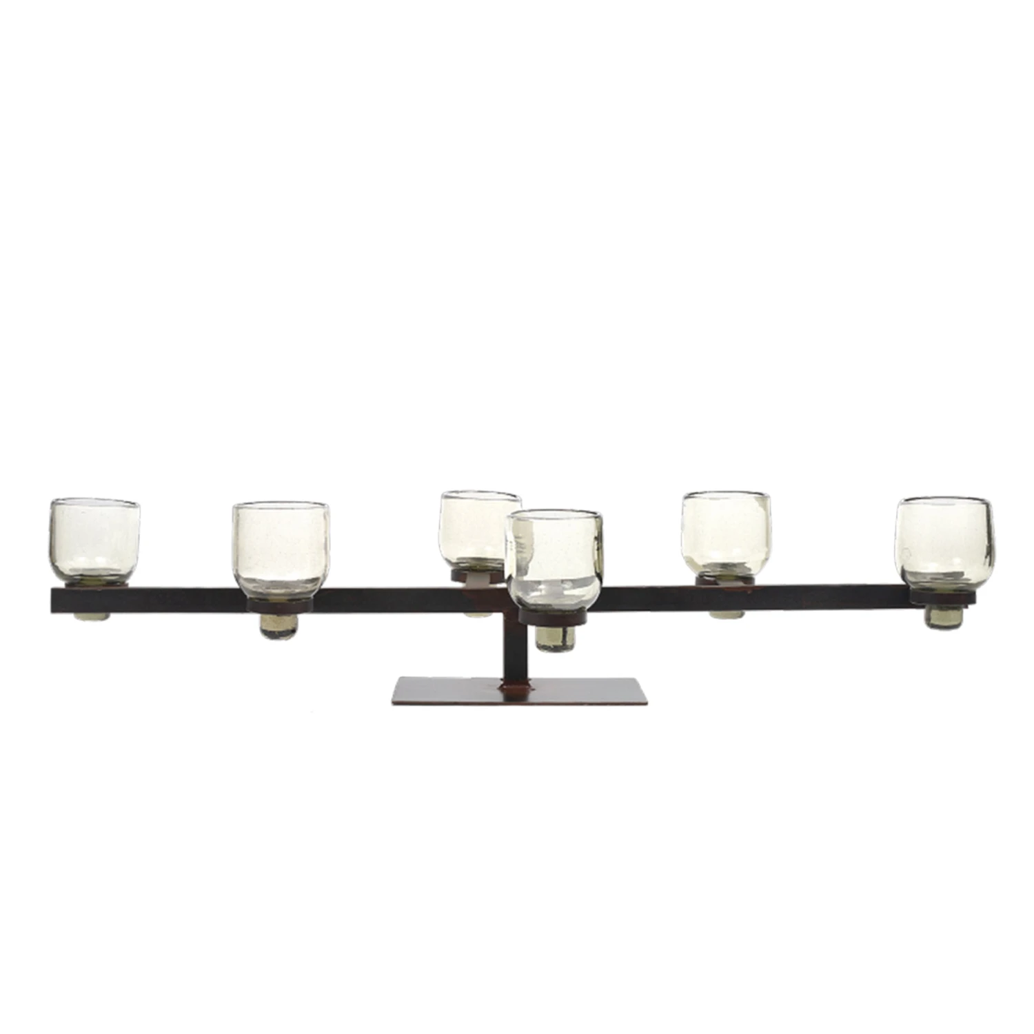 - Wax cast iron candleholder with asymmetrical arrangement and mouth-blown glass tazόnes for candlelight, tequila, flowers