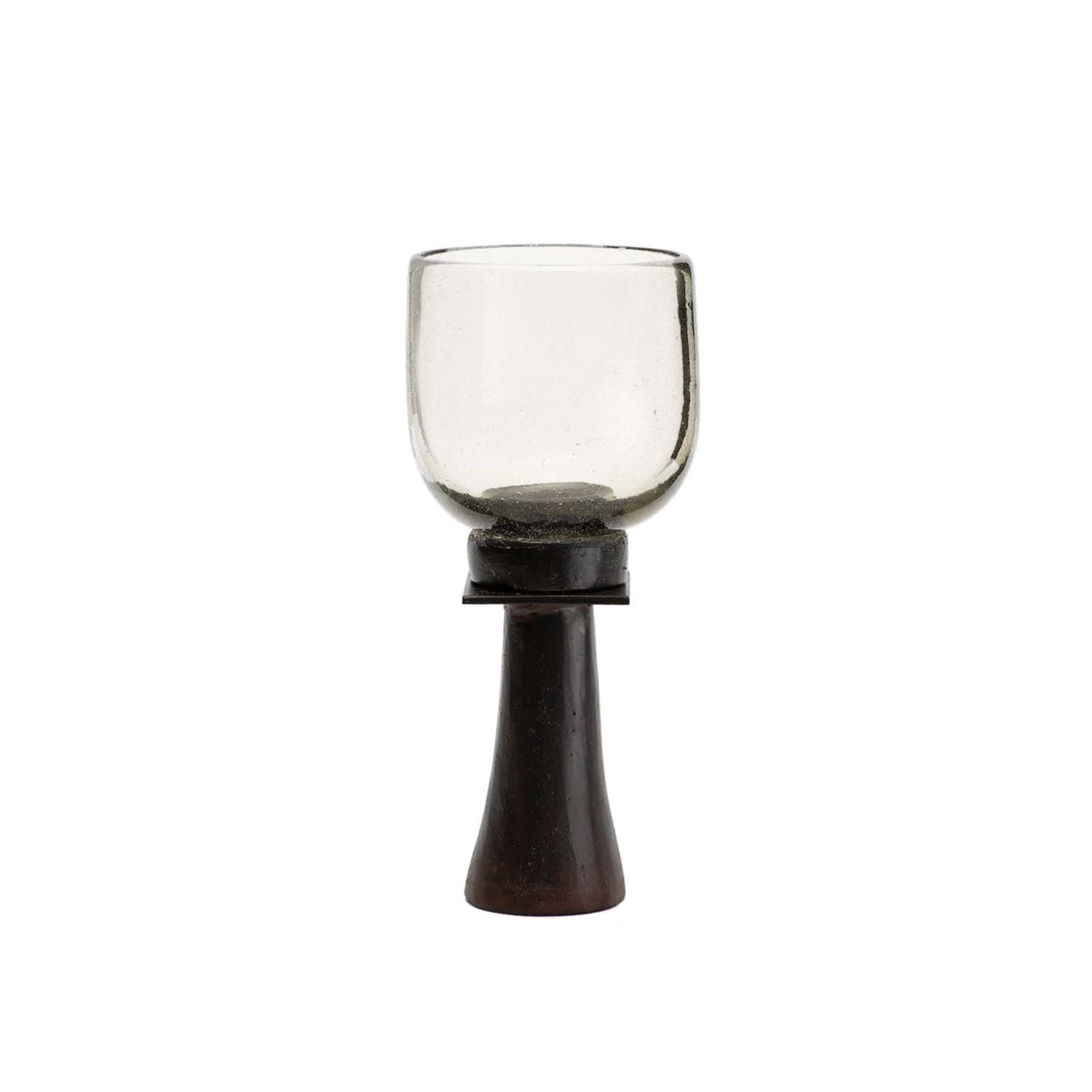 - Mouth-blown glass vessel standing tall on a sturdy smooth iron stem